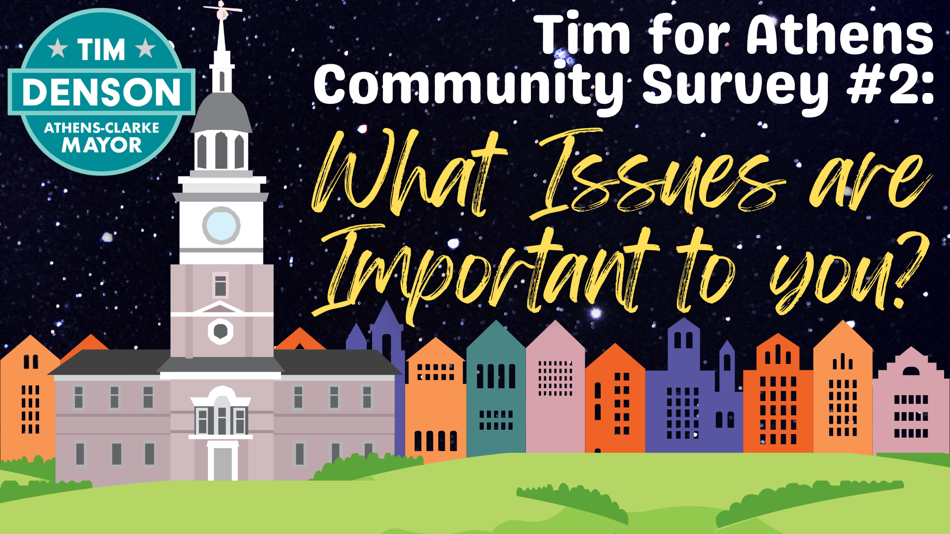 The point of campaigning shouldn’t just be me talking to you. It should be me listening to you, learning from you also. Here is the second short survey (What Local Issues are Important to You?)in a series of monthly surveys to gather insight from you so that the Tim for Athens campaign can better understand the needs and wants of Athens and it’s people!